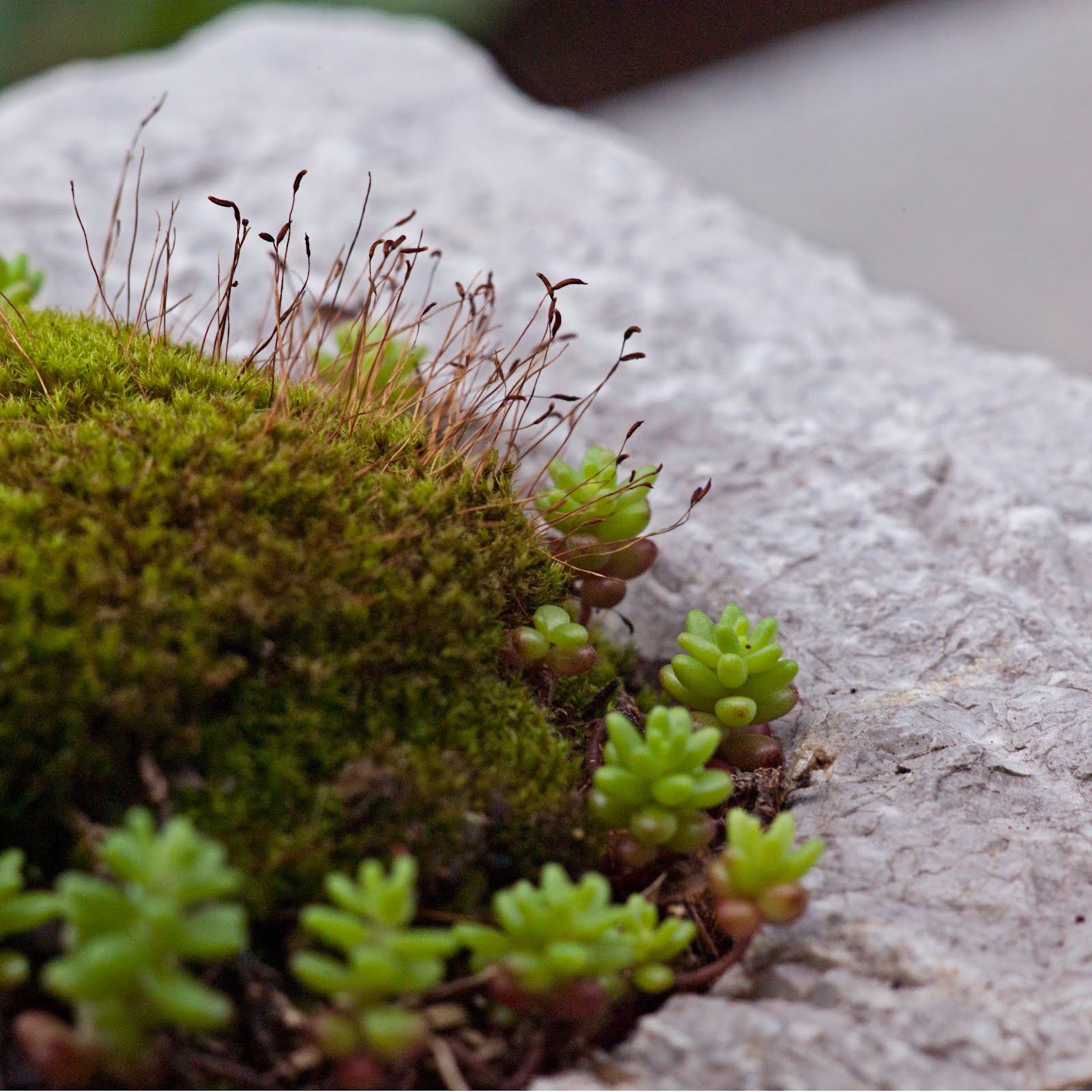 Today, I restrain myself. The moss blooms! Its stringy, goofy flowers nod their burgundy heads to one another, wave, giggle and delight in the day.